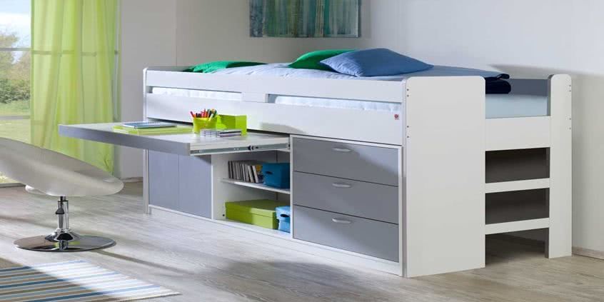 Łóżko antresola z kolekcji Nicole zawiera dodatkowo komodę z wysuwanym blatem, które idealnie sprawdzi się jako biurko. Meble typu 2w1 stanowią doskonałe rozwiązanie dla wszystkich tych, którzy borykają się z problemem wyboru odpowiednich mebli do pokoju dziecka. Łóżko antresola z kolekcji Nicole dostępne jest w różnych wariantach kolorystycznych.
