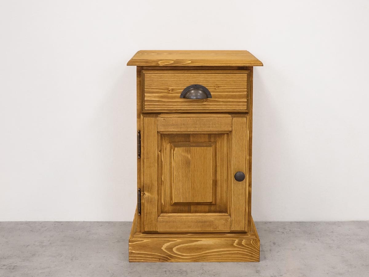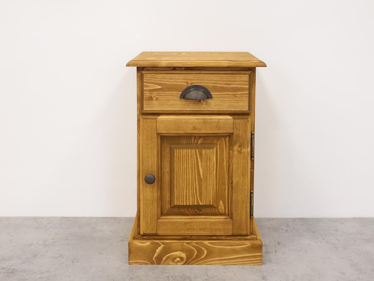 Rustykalna szafka nocna została wykonana z naturalnego drewna świerkowego oraz zabezpieczona olejem w kolorze whisky, dzięki czemu wyróżnia się trwałością oraz przyjemnym, ciepłym wyglądem. W zestawieniu z łóżkiem utrzymanym w podobnym stylu tworzy spójną, harmonijną aranżację sypialni.