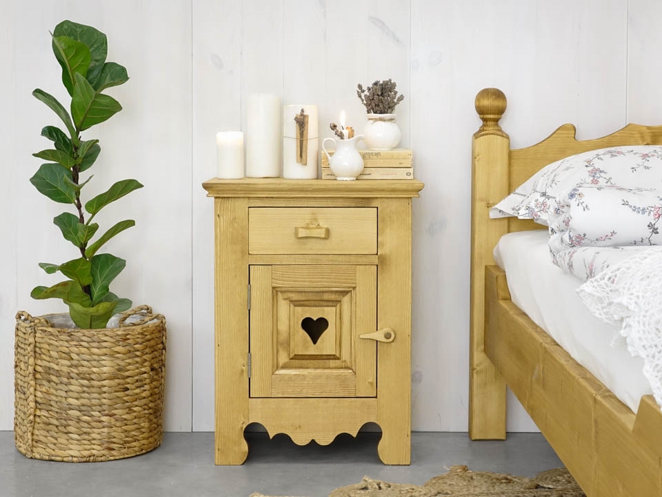 Drewniana szafka nocna w folklorystycznym stylu, z czarującym zdobieniem i uroczym sercem na frontach drzwiczek, zamykanych na drewniany skobel. Posiada praktyczną szufladę pod blatem.